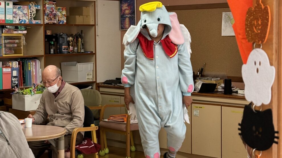 こちら世田谷区内のデイホーム!ハロウィンだー!とおじいちゃまContinue reading2024,10,30 デイホームでのハロウィンイベント!本格的に仮装してます!やるね!